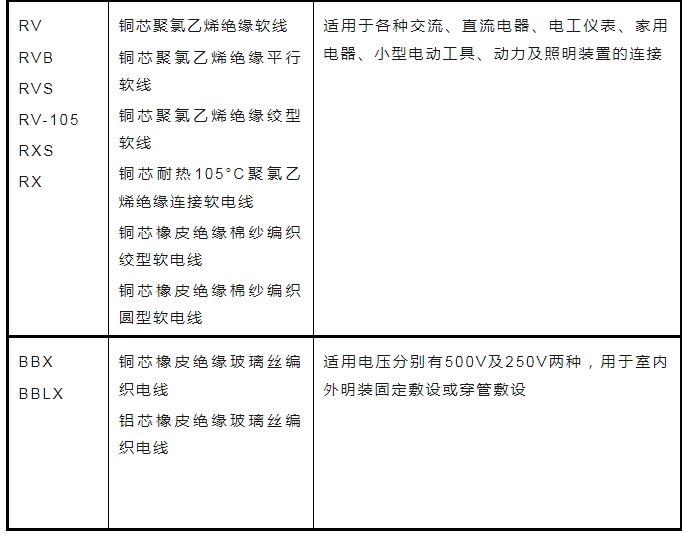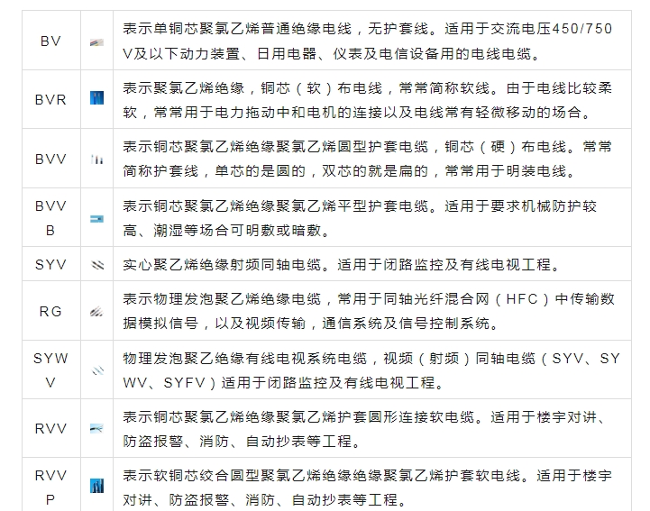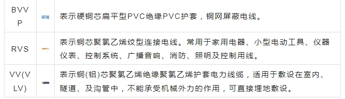 注:B(B)——第一個(gè)字母表示布線,第二個(gè)字母表示玻璃絲編制。V(V)——第一個(gè)字母表示聚乙烯(塑料)絕緣,第二個(gè)字母表示聚乙烯護(hù)套。L(L)——鋁,無L則表示銅F(F)——復(fù)合型R——軟線S——雙絞X——絕緣橡膠